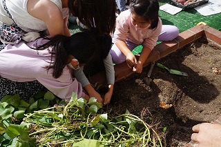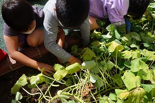 秋になり,さつまいもの葉が黄色くなってきました。子どもたちは芋掘りをとても楽しみにしていました。泥んこになりながら,一生懸命掘ります!「大きいものや,小さいものなど色んな形があっておもしろい!」と,初体験の子もたくさんいて,とても楽しい収穫になりました。