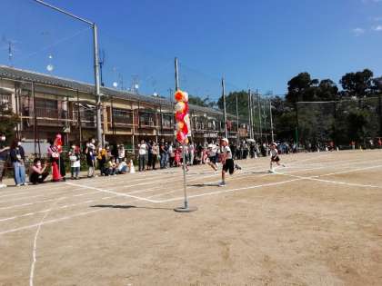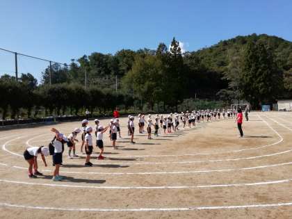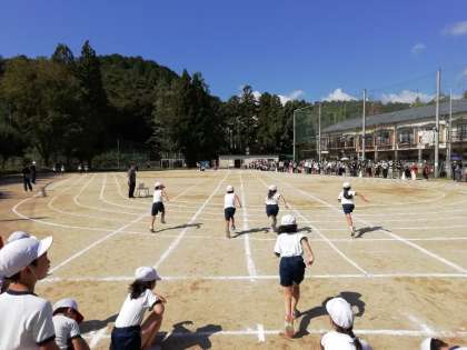 3時間目は1年生。まずは準備体操をして,50mを力いっぱい走りました。