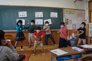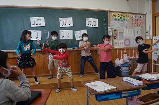 これまでの学習で,いろいろなリズムに親しんできた子どもたち。今日は,お祭りの音楽に合わせてリズム打ちに挑戦しました。そして,お祭りの音楽に合わせて体をうごかしました。上手な人には前に出て踊ってもらいました。楽しそうにそれぞれがお祭りの音楽に親しんでいました。