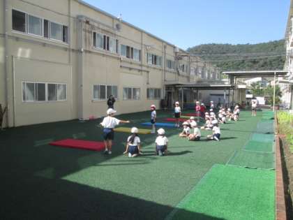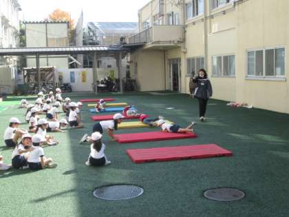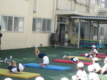 マットの上でいろいろな方向に転がったり,体を支えたりする運動を通して,順番やきまりを守ったり場や用具の安全に気をつけたりしながら学習をします。今日はとてもいい天気で,ぽかぽか陽気で気持ちいいです。体育日和です。