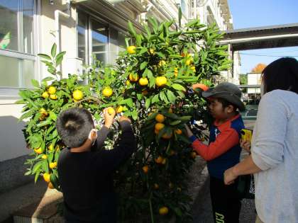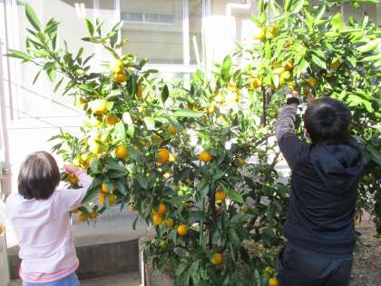 今年は,にじのこガーデンで育てているみかんの木に,たくさんの実がなりました。秋に入り,緑から黄色にだんだん色づいていくみかんを見ながら,収穫するのを楽しみに待っていました。収穫の日,「どのみかんにしようかな?」わくわくしながら,みんなで立派に実ったみかんを収穫しました。