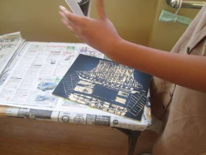 わら天神に行ってスケッチをして,下絵を描いて彫り進めてきたきた版画も,いよいよ試し刷りです。どんな感じに刷り上がるのか,どきどきします。