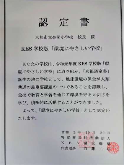 昨年度の本校の取組が,NPO法人 KES環境機構から,KES学校版「環境にやさしい学校」として認定され,先日,認定証をいただきました。森林教室における衣笠山でのフィールドワークや校舎改修に合わせての環境学習等を評価していただきました。