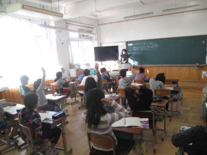 目的に応じた見積の仕方を工夫し,日常生活で使われている概数を調べ,概数についての理解を深める学習です。今日は「四捨五入」について学んでいます。桁数の大きい数を四捨五入によって,上から2桁や上から3桁の概数に直しています。四捨五入よりも,「上から〇桁の概数で表す」ということが,子どもたちにとっては難しい学習です。しっかり学んで,生活の中で概数の考え方を活かせるようになってほしいです。