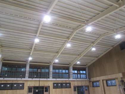 工事中の講堂の中の様子の写真を撮らせていただきました。照明も取り付けられていて,とても明るいです。内壁は上部だけが仕上がっていて,下のほうはこれから板を張って仕上げていかれるそうです。それが終わればいよいよ床の工事です。