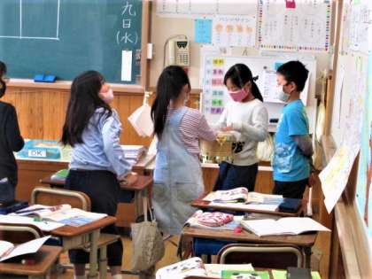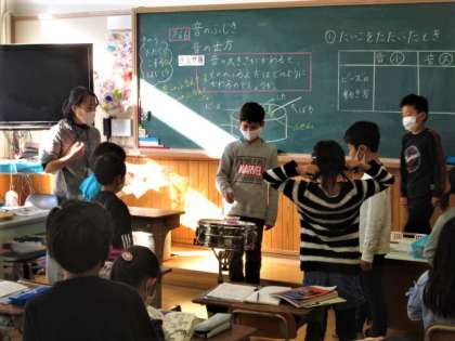 物から音が出たり伝わったりするときに,物が震えていることを確かめる学習です。音楽室から楽器を持ってきて,その上に物を乗せて音を出して,震えることを確かめています。目に見えない音を,目に見える形で確かめるために,工夫をしながら学習をしています。