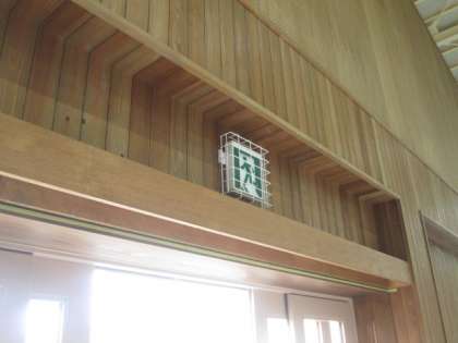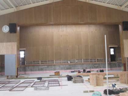 この間まで,舞台の前にまだあった足場が,なくなりました。まだ舞台はできていませんが,足場がなくなったので,取り付けていただいている時計やスピーカーもよく見えます。後ろの出入口の上には,非常口のマークも。