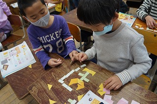 長方形,正方形,直角三角形の形について学習しました。今日は,それらの形を組み合わせてできる規則的な模様や,形を作りました。実際に形を動かすことで,いろいろな気付きがありました。