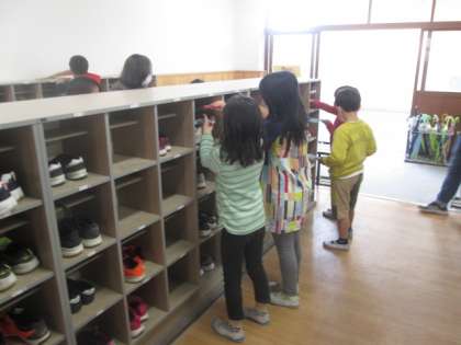 大掃除の時間を使って,エントランスのくつ箱の中をきれいにしている学年もあります。小さいほうきや短いほうきを使って,中の砂を掃きだしています。自分たちが毎日使っているところをきれいにするのは,大切なことですね。