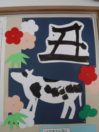 昨日は始業式。丑年の「丑」の字の書き初めをしました。みんなでリレーして協力して書きました。牛の模様もみんなで交代で楽しくかきました。今年もみんなでなかよく学習していきましょう。