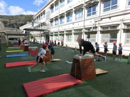 今日は太陽が照っていても寒い一日です。ですが,子どもたちはとても元気に外で運動したり遊んだりしています。体育では,跳び箱運動に取り組みました。自分の目標に向けて,意欲的にチャレンジしていました。