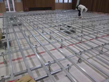 年が明けて,いよいよ床の工事が始まりました。コンクリートの上に,鋼製床を設置してくださっています。その上に,板材を敷き詰めて,最後に仕上げの板材を貼るという,3層構造だそうです。講堂の床下って,このようになっているのですね。