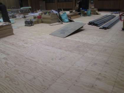 一昨日,見せていただいたときは,鋼製床を施工されていたのですが,今日見せていただいたら,体育館の床一面,板材が敷き詰められていました。とても速い作業で,驚きです!
