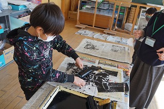 自分が楽器で演奏している姿を,紙版画であらわしました。いよいよ作った紙版画を和紙に写しました。どんな仕上がりになるか,ドキドキしながら写していました。