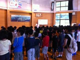 2日目の朝の集いは,音羽川小学校のお友達と一緒に行いました。