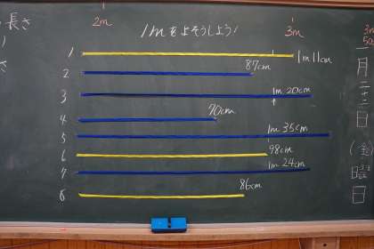 「黒板の長さは何cm?」という問いから始まり,100cm=1mの長さを予想しました。自分たちの身長を基に予想したり,机の長さから予想したりして,工夫して1mの予想をしていました。