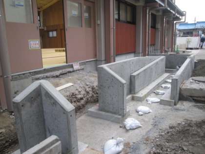 以前は,南側出入口にしかスロープがなかったのですが,新しく,西側の前の出入口にもスロープを付けていただきます。その土台ができてきています。これまで,選挙で講堂を地域の皆様にご使用いただくときには,前日に,業者がスロープを設置していたのですが,これからは,その必要もなくなります。どんな感じに仕上がるのか,楽しみです。