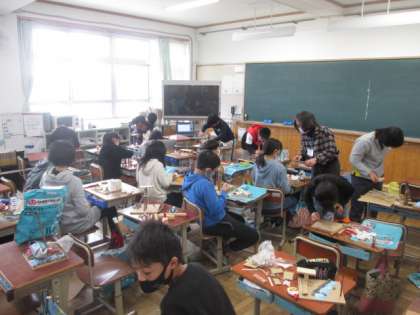 自然のものを生かして,自分の思いをこめた作品を作っています。土台は全員同じ木の板ですが,それ以外の材料は,自分で選んだ木の枝や木切れや紙,毛糸等々,環境にやさしいものばかり。家から持ってきたものもあります。プラスチック素材のものは使いません。子どもたちは,いろんなアイデアを出して,楽しい作品を作っています。