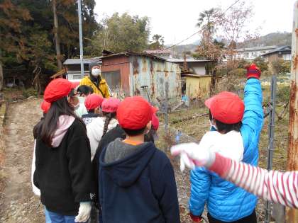 森林教室で衣笠山に行ってきました。シカやイノシシなどの足跡や,糞,穴を掘った後など,野生動物の生態に触れたり,3年生で設置をした「巣箱」を外したりと衣笠山の自然に触れることができました。また,インストラクターの方々から,衣笠山に住む鳥や動物,植物について,たくさんのお話をしてくださいました。最初から最後まで眼をキラキラ輝かせ,いつも触れることのない大自然に興味津々の子どもたちでした。