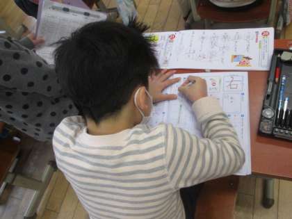 今日は,「右」という字を学習しています。1画目は,縦(上から左にはらう画)です。「左」という字は,1画目が横(左から右に書く画)なので,間違えやすいところです。大人でも,正しい筆順で書いていない人もいる字ですが,1年生で習うのですね。正しい筆順で丁寧に書けるように練習しています。