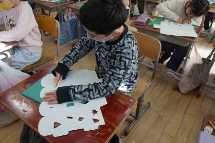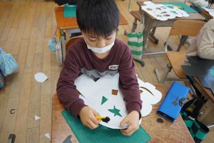 2年い組では,自分の考えた形に沿って,カッターナイフで切り取る活動をしました。切り取った形に,カラーシートを貼り付けて,光に当てるときれいに光るようにしていきます。カッターナイフを使うのはなかなか難しいですが,どんどん上手になっています。