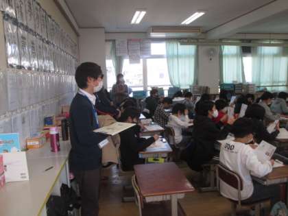 6時間目に,衣笠中学校の先生方が,教室に,小学校の学習の様子を見に来てくださいました。4月から多くの人がお世話になります。よろしくお願いします。