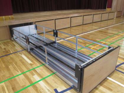 舞台の床下の台車も新しくなりました。長椅子などを入れておくところです。これまでとちがって,とても使い勝手がよさそうです。