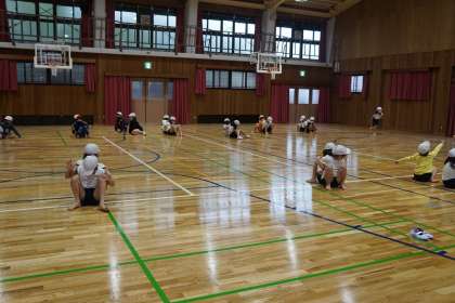 新しくなった講堂に初めて入りました。講堂に入った瞬間,感動と興奮で飛び跳ねる子どもたち。「この匂い,変わってない!」と,とても嬉しそうでした。