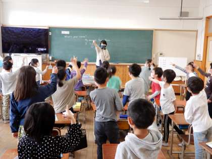 外国語活動の時間にALTのメリッサ先生と一緒に学習をしました。メリッサ先生と学習するのは初めてだったので,自己紹介をしてもらい,たくさん質問をしました。最後に英語でジャンケン大会をし,楽しく英語に触れることができました。