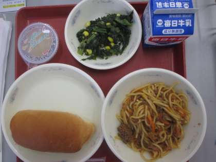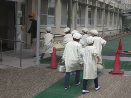 今日からいよいよ給食が始まります。給食時間が近づいてきたころ,給食室からはとてもいいにおいがしてきました。子どもたちにとっても,初めての給食は楽しみだったようで,給食当番の子どもたちも,とてもうれしそうに給食を取りに来ていました。