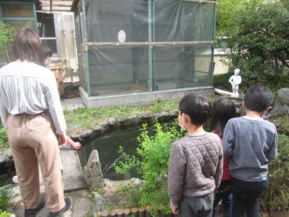 い・ろ組のみんなで,講堂の裏にあるひょうたん池の観察に行きました。池の中には鯉やめだかなどの魚が気持ちよさそうに泳いでいました。夏になったら,もっとたくさんの生き物に出会えるかもしれませんね。