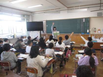詩を読んで,感想を交流しあい,自分のおもいや考えを広げる学習です。5年生に進級して,教室が北校舎から南校舎に移った子どもたち。ひとつ上の学年に進級したうれしさが,しっかりと手を挙げている様子からも感じられます。いよいよ高学年の仲間入り。がんばれ,5年生!