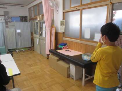 先週から実施していた身体計測も全学年が終了し,今日から視力検査を始めています。今日は6年生の検査日です。今年度は,遮眼子(眼をかくすための道具)を使わず,自分のハンカチで片目ずつを覆い,検査を受けています。