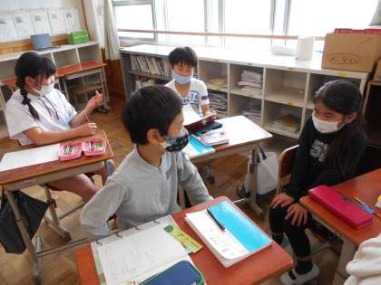 5年生の国語科「きいて,きいて,きいてみよう」という単元で,話の意図を考えて聞き合う学習を行っています。上手に聞くために大切なことは何なのかを考えながら,ペアで休日の過ごし方についてインタビューを行いました。