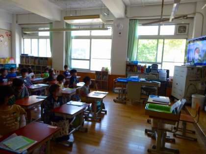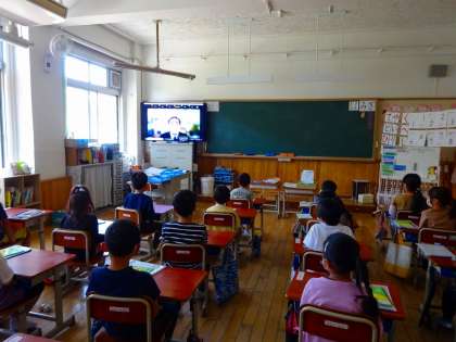 教室のテレビからの校長先生や教頭先生の話を