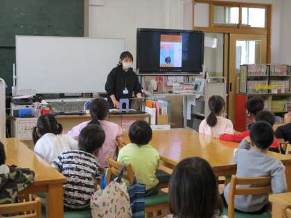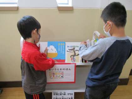 その後「あいうえお」の関連図書をたくさん集めて学年のブックトラックに置きました。休み時間にはさっそく読みたい本を取り出しめくっていました。