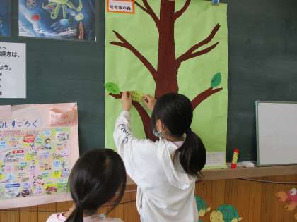 今年度は学年ごとに目標冊数やページの基準を設け,段階を踏んで達成するごとに「読書家の森」に葉っぱや花を貼っていく取組をしています。普段は10冊達成するごとに担任の先生からサインをもらっているのですが,「読書家の森」の基準を達成した子どもは図書館に記録した読書ノートを持って葉っぱをもらいに行きます。そして,もらった葉っぱに自分の葉っぱだとわかるようにサインをしたり,大好きな本の題名を書いたりして貼り,みんなで森を作っていきます。さあ,どんな森が出来上がるでしょうか。これからが楽しみですね。