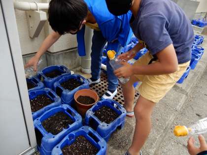 理科で植物を育てていきます。前日にたねを観察し,今日はオクラを個人で,ヒマワリ・ダイズ・ホウセンカの中から2種類をグループでたねまきました。これからどのように成長するか楽しみです。