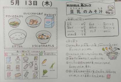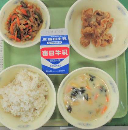 本日の献立は「野菜のきんぴら,鶏肉のからあげ,牛乳,麦ごはん,豆乳のみそ汁」です。豆乳は,別名「畑の肉」とも呼ばれる大豆を原料としているため,良質な植物性たんぱく質が豊富に含まれているそうです。料理に入れるとまろやかさも増し,体にも良いです☆