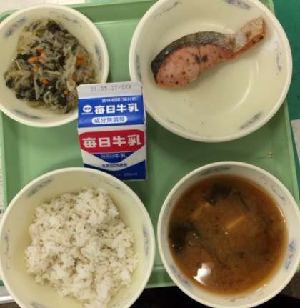 本日の献立は「小松菜と切り干し大根のにびたし,鮭の塩こうじ焼き,牛乳,麦ごはん,みそ汁」です。みそ汁には,京都市の京北地域で作られた「京北みそ」が使われていて,地産地消の献立です☆