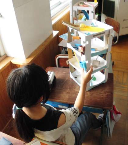 4年生は思い思いにビー玉が転がる立体迷路を創作していました!
