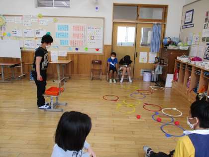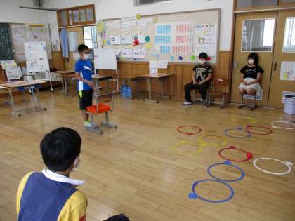 今日の6時間目に,5・6年で玉入れをしました。輪っかを目がけて玉を投げます。輪っかの色によって,獲得する点数が違うので,みんな真剣にねらいます。点数はみんなで相談して決めました。白は200点,青は100点,赤は10点,黄は5点。得点の計算は6年生の担当です。数が多くなると,九九を使って計算します。みんなで役割分担をしながら,仲良くゲームを楽しみました。