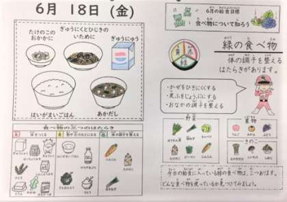 本日の献立は「たけのこのおかかに,牛肉とひじきのいために,牛乳,胚芽米ご飯,赤だし」です。「緑の食べ物」には体の調子を整えるはたらきがあり,風邪をひきにくくしたり,皮膚を丈夫にしたりしてくれるようです☆
