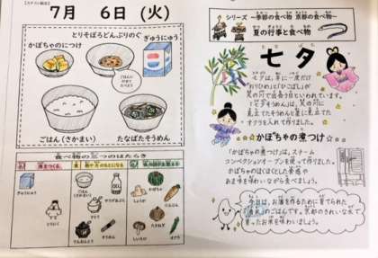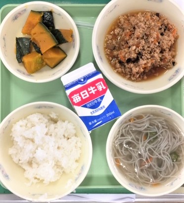 本日の献立は「かぼちゃの煮つけ,とりそぼろどんぶりの具,牛乳,ごはん(さかまい),たなばたそうめん」です。本日は「酒米」(お酒を作るために育てられたごはん)でした!