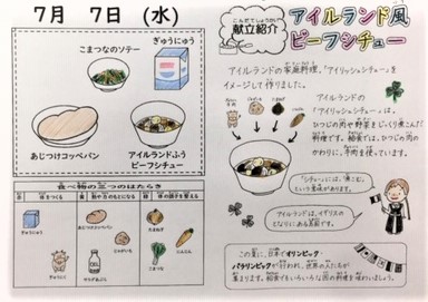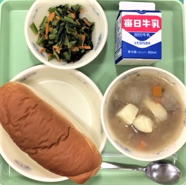 本日の献立は「小松菜のソテー,牛乳,あじつけコッペパン,アイルランド風ビーフシチュー」です。アイルランドはイギリスの隣にある島国で,家庭料理「アイリッシュシチュー」には,羊の肉が材料として使われているようです☆
