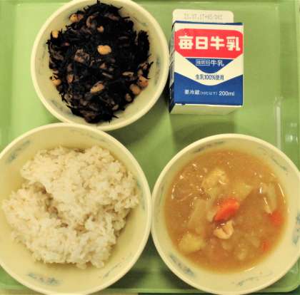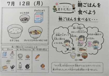 本日の献立は「ひじき豆,牛乳,麦ごはん,鶏肉と野菜の煮つけ」です。「朝ごはん」をしっかりと食べることで,体温が上がったり,脳に栄養がまわって集中力が高まったりするようです。「朝ごはん」をしっかりと食べることは大切ですね☆