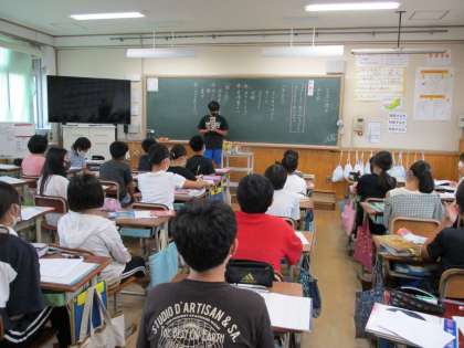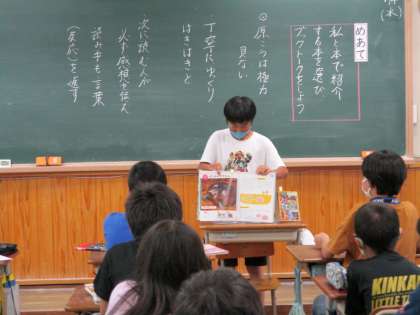 「ブックトーク」とは,一つのテーマに沿って,何冊かの本を紹介する活動のことです。6年生は指導者の例を参考に,自分が選んだ2〜3冊の本についてのシナリオを考えました。友達に紹介する場面では,メモはできるだけ見ずに,自分の言葉で本の魅力について語ることができました。聞く人は伝える人の考えをしっかり受け止め,質問したり,感想を述べたりすることができました。