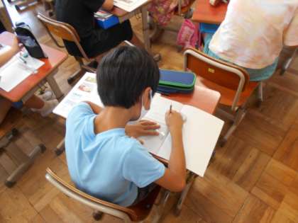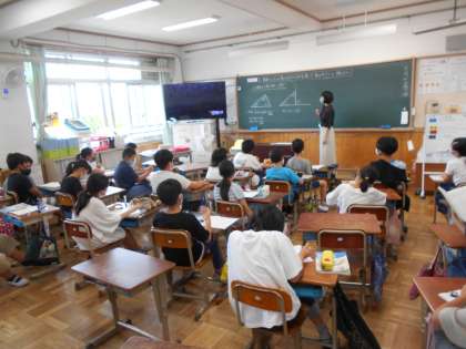 5年生の授業の様子です。い組は社会「米作りのさかんな地域」の授業で米作りに携わる人々について調べ学習を行っています。ろ組は算数「合同な図形」の授業で計算で角度を求める練習をしています。どの子どもたちも一生懸命に頑張っています。