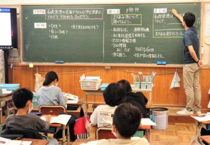 「長崎漁港では,どのようにしてたくさんの魚をとっているのだろう。」という学習問題のもと,沖合漁業・まきあみ漁について調べ,魚の種類や漁場に合わせた漁法を行うことが大切だということを学んでいました。