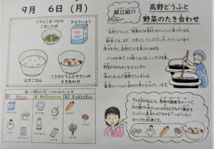 本日の献立は「ツナとこまつなのごまいため,牛乳,麦ごはん,高野どうふと野菜の炊き合わせ」です。<高野どうふと野菜の炊き合わせ>の「高野どうふ」と「野菜食材」は火の通りや味のしみこみ方が違うので,別々に煮合わせて,一つの器に盛りつける「たき合わせ」という煮物の調理法で作られています☆